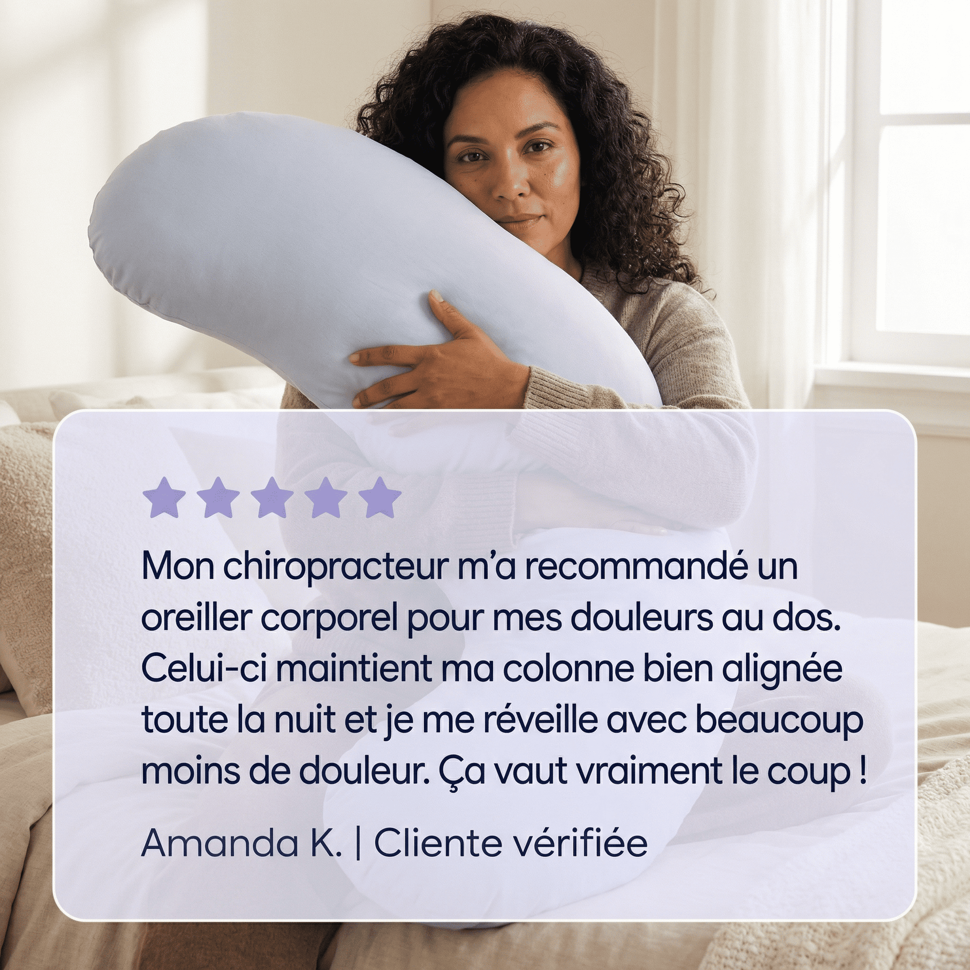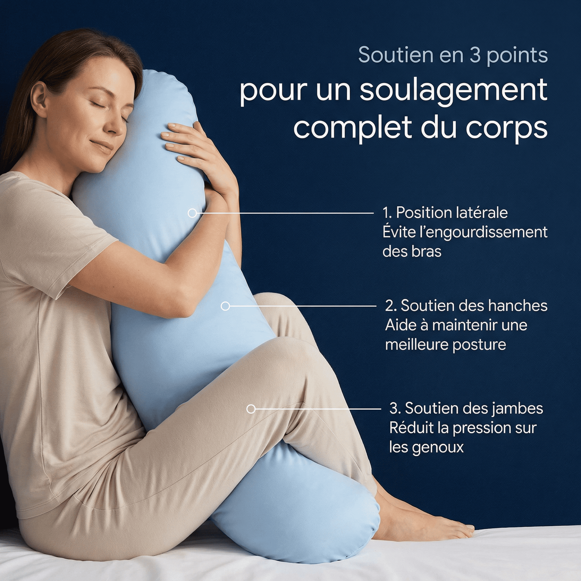 L'Oreiller Corporel Somnola™ cible chaque zone de tension pour un alignement naturel du corps, du coucher jusqu'au réveil.