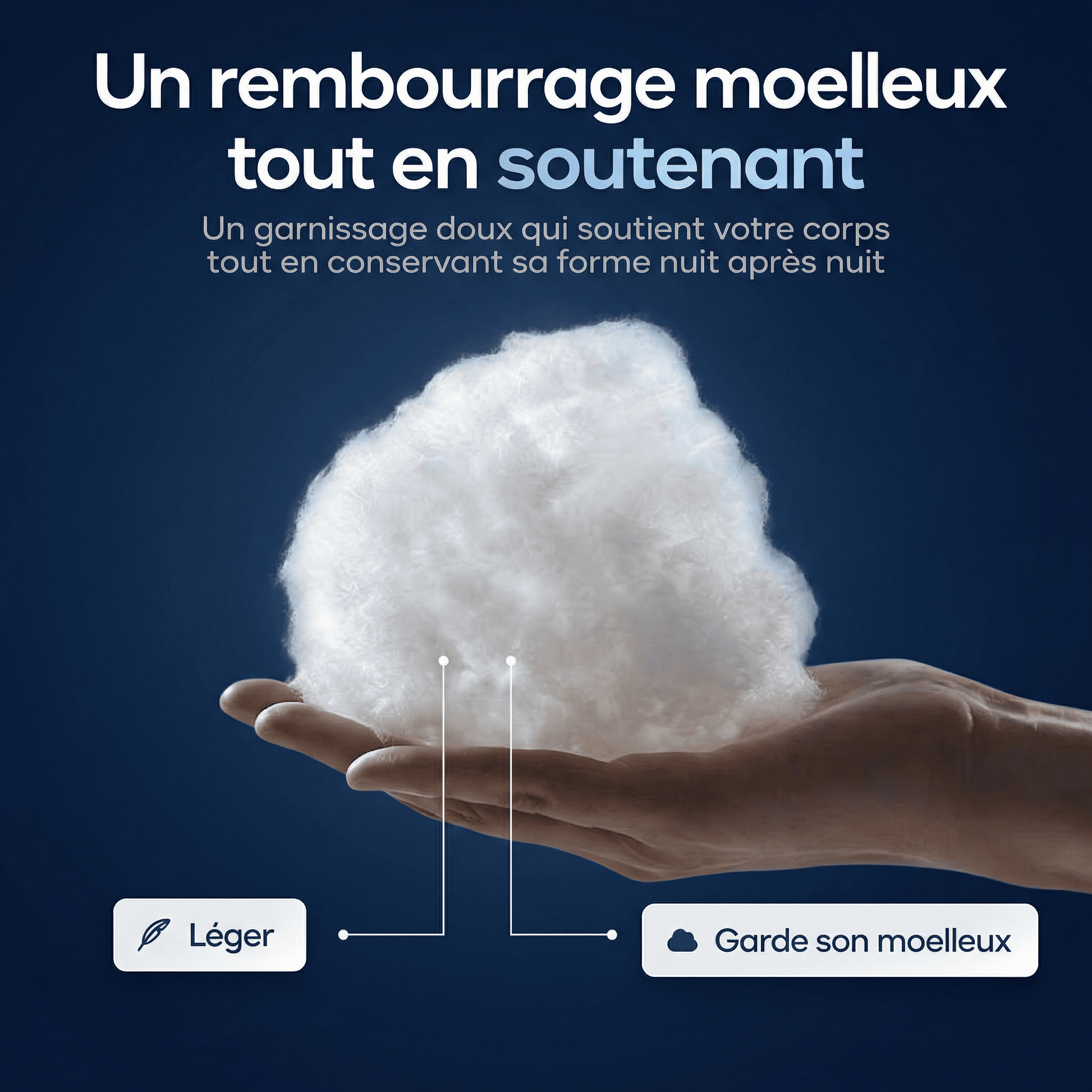 Le rembourrage en fibres haute densité offre un confort réactif qui épouse les contours du corps sans s'affaisser. Il conserve sa forme et son gonflant nuit après nuit, sans avoir besoin d'être regonflé ni remplacé.